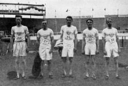 Gayle Dull, UM Track, posed with U.S. Three-Mile Team at 1908 London Olympic Games