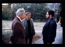 Older man and Mike Wallace speaking with younger, bearded man in a courtyard